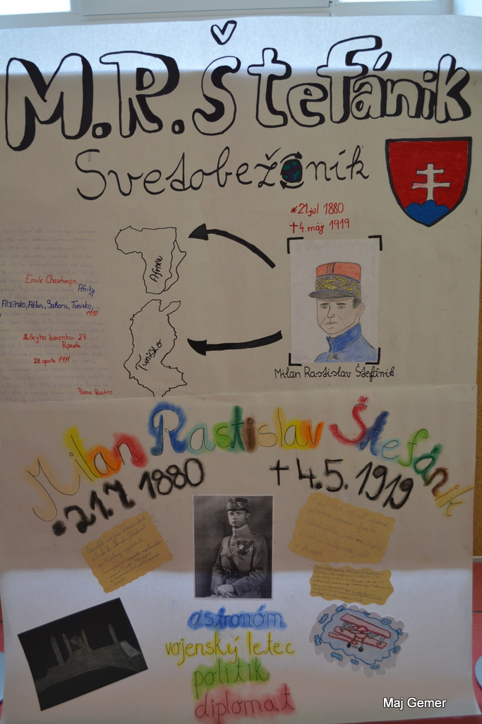 Žiaci a učitelia II. stupňa našej školy sa zoznamovali s M.R. Štefánikom v školskej knižnici cez encyklopédie, pomáhali si informáciami z internetu. Rozobrali si po triedach Štefánika ako všestrannú osobnosť. Každý kolektív sa venoval len časti životnej etapy jeho života. Tak vytvorili žiaci druhého stupňa komplexný obraz o Štefánikovi cez dielčie projekty. Získali informácie a množstve životných príležitostí, ktoré tento významný človek využil.