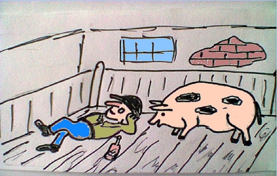 Bola neskorá jeseň. Laco Čatlóš prišiel do kancelárie a pýtal si na piatok dovolenku, lebo potrebuje urobiť chlievik pre prasiatko, s tým, že v pondelok príde do práce. V piatok som pridelil Jožkovi pomocníka, lebo ich rúbanie bolo toho času najproduktívnejšie a rudu do ťažby som potreboval. Víkend prešiel ako voda a v pondelok som robil felez (zápis). Čítal
