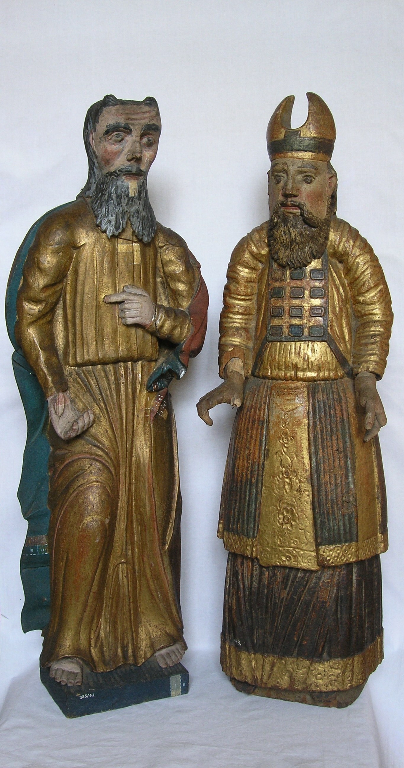 Postavy Mojžiša a Árona sú ustálenými ikonografickými typmi v protestantskom umení Gemera-Malohontu. V tomto prípade ide o oltárne skulptúry, ktoré boli súčasťou mobiliára kostola. Pri postave Árona s určitosťou vieme, že pochádza z kostola v Drienčanoch. Obe vznikli približne v období prvej polovice 18. storočia a nesú znaky domáceho barokového slohu viažuce sa k miestnej tradícii, ktorá nachádzala svoje pôsobisko v regionálnych remeselných dielňach. Pri Mojžišovi chýba v jeho pravej ruke atribút – dosky s Desiatimi božími prikázaniami. Skulptúry boli reštaurované v roku 1993.