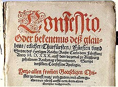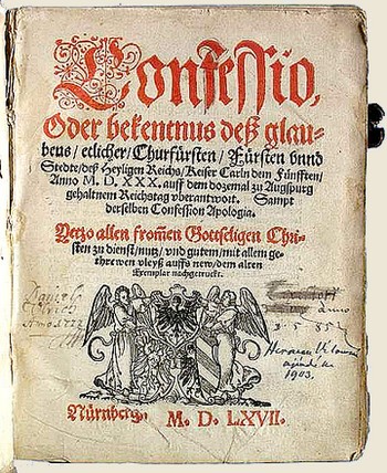 Confessio, oder bekentnus des glaubens /etlicher/ Churfursten/ Fursten unnd(?) Stedte/ des heyligen Reichs /Keiser Carln dem fuenfften/ Anno M.D.XXX, auff dem dozemal zu Augspurg gehaltnem...Confession Apologia. (Confessio, alebo vyznanie veriacich niekoľkých kniežatstiev a miest svätej ríše cisára Karola V. V roku 1530 z povinnosti ríšskeho snemu v Augsburgu darované všetkým pokorným poddaným slúžiacim Kristu.... Obrana