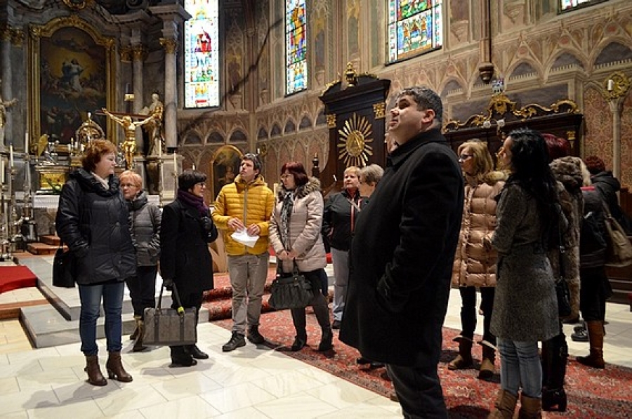 V katedrále pedagógov odborne sprevádzal Mgr. art. Tomáš Székely, ktorý okrem vzácnej tabuľovej maľby Metercia upriamil ich pozornosť na neskorogotické pastofórium (1507) hlavný oltár, kazateľnicu, nástenné maľby či iné vzácnosti a zaujímavosti. Na záver spestril prehliadku katedrály ukážkou organovej hudby Mgr. Tomáš Mag, kaplán rímskokatolíckej farnosti v Rožňave. Touto cestou by sme chceli poďakovať jej predstaviteľom za umožnenie prehliadky.