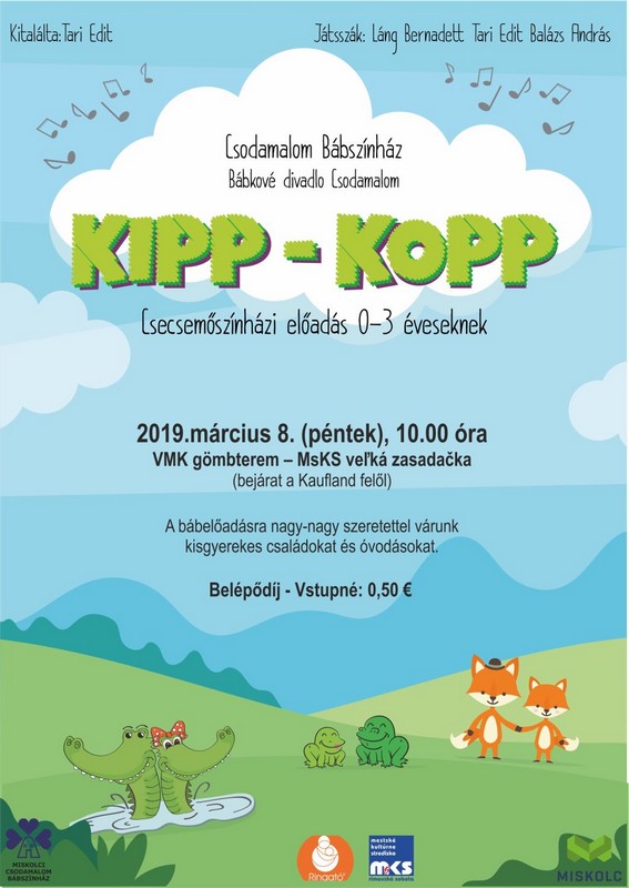 Pre maďarsky hovoriace mamičky s deťmi do 3 rokov bude v piatok 8. marca v Rimavskej Sobote pripravený program bábkového divadla Csodamalom s názvom KIPP - KOPP.
