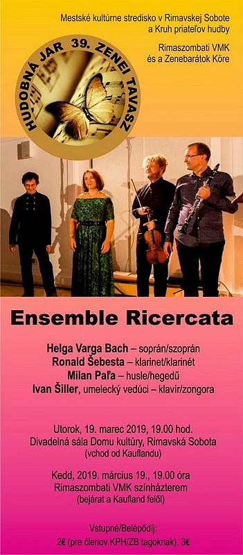 Hudobná jar predbehne tú astronomickú a prvý koncert jej 39. ročníka sa v divadelnej sále Domu kultúry v Rimavskej Sobote uskutoční v utorok 19. marca. Hlavnou ideou hosťujúceho hudobného telesa Ensamble Ricercata je sprístupňovanie a popularizácia domácej i svetovej súčasnej komornej tvorby.
