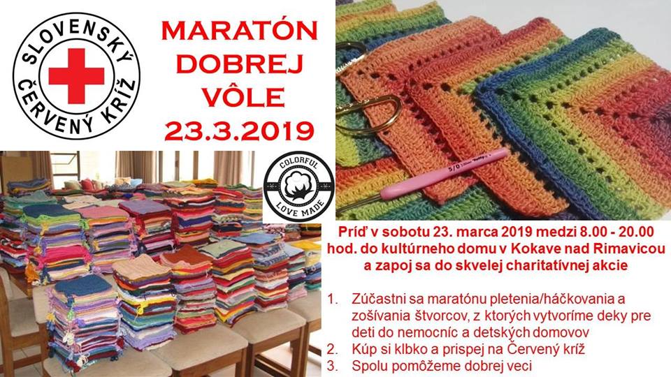 Na predposlednú marcovú sobotu (23.3.) je už naplánovaná charitatívna akcia Maratón dobrej vôle, na ktorom budú pomocou pletenia, háčkovania a zošívania štvorcov vytvorené deky pre deti do nemocníc a detských domovov. Kúpou klbka prispejete na Červený kríž.