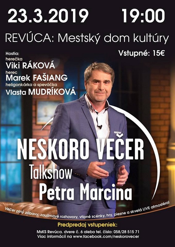 Ak vás láka možnosť zažiť na vlastnej koži atmosféru živého nakrúcania zábavnej relácie, neváhajte a navštívte v sobotu 23. marca Mestský dom kultúry v Revúcej. Chystá sa tam Talkshow Neskoro večer. Hosťami obľúbeného Petra Marcina budú herečka Viki Ráková, herec Marek Fašiang, heligonkárka a speváčka Vlasta Mudríková.