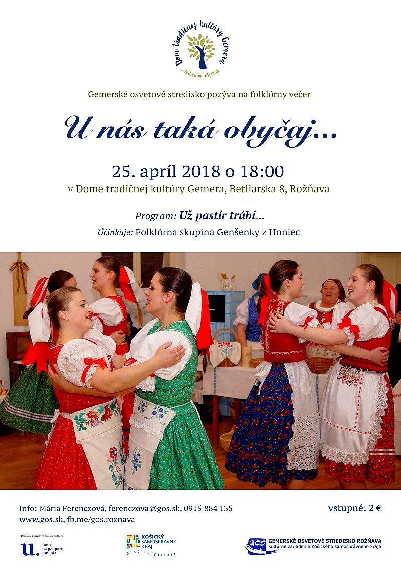 Jarný folklórny večer v Dome tradičnej kultúry Gemera v Rožňave v stredu 25. apríla ponúkne svojim priaznivcom zaujímavý program. Folklórna skupina Genšenky z Honiec z rozprávania najstarších obyvateľov obce spracovala tému vyháňania dobytka na pašu. „Začiatok spoločného pasenia dobytka po zime bolo veľkou dedinskou udalosťou. Zvyčajne to bývalo napríklad na Zelený štvrtok, na Ďura, alebo 1. mája, podľa podnebných podmienok obce. Reálny termín bol daný aj počasím či zásobami krmiva po zime. Ako to bývalo v Honciach sa dozvieme práve z ich programu,“ doplnila Mária Ferenczová z Gemerského osvetového strediska v Rožňave.