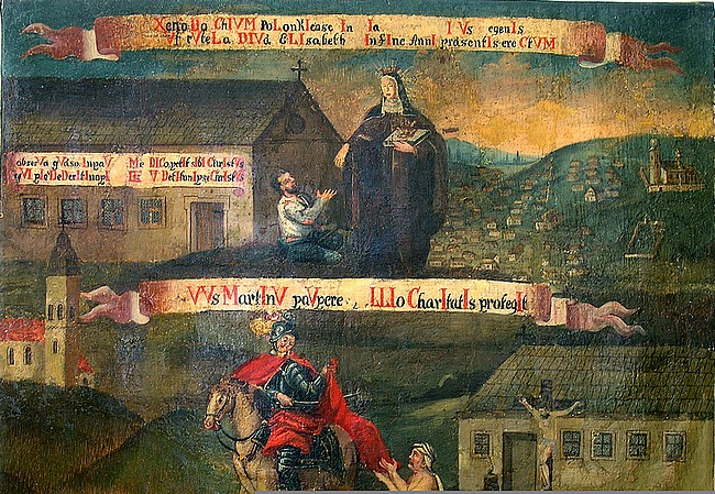 V obci Polomka, patriacej do muránskeho panstva, bol v roku 1725 grófom Štefanom II. Kohárym založený útulok pre chudobných, ktorého historická podoba je zachytená na našom diele. Kompozícia obrazu je členená do dvoch horizontálnych plánov nad sebou. V spodnom pláne je zobrazený svätý Martin na koni, ktorý rozrezáva svoj plášť a delí sa oň so žobrákom. V hornom pláne je postava svätice Alžbety Uhorskej (Durínskej ), ktorá je patrónkou charitatívnej činnosti. Do obrazu sú vkomponované latinské texty, tzv. „hovoriace pásky“ („banderole“). Predpokladaný význam textu: