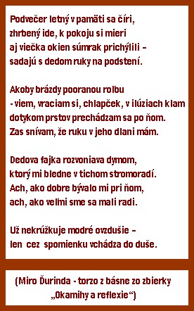 Putovanie neviem skončiť bez sentimentu. Všetkým z nás náš cintorín vracia tú neopakovateľnú atmosféru blízkosti našich najmilších, celú paletu spomínaní, ale i ducha odbehnutých čias. Mňa nevynímajúc: