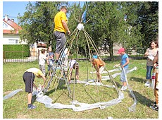 Prvé dva dni boli naozaj pestré. Za pomoci dospelých deti postavili vigvam (kopulovitý stanový príbytok severoamerických Indiánov, najčastejšie z byvolých koží), u nás s použitím netradičného materiálu, zhotovovali si rôzne čelenky a náramky, pripravovali si návrhy nákresov na totem (u severoamerických Indiánov plastický symbol mystického predka, od ktorého kmeň odvodzuje svoj pôvod), ktorý potom aj tvorili, spoznávali rastlinky, sťahovavé vtáky, stopy zvierat, prostredníctvom filmu sa dozvedeli niečo nové o sovách a popri tom si aj zasúťažili. Po obede, ktorý je zabezpečný v neďalekej jedálni, je chvíľa aj na oddych, čo vidno aj na samotných fotografiách. Pred nami sú ešte tri dni tvorivých aktivít a zábavy.