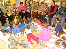 Pri tejto príležitosti deti zo škôlky s učiteľkou Evkou a čitatelia knižnice v našej obci sa poďakovali kytičkou uvitých slov za nevýslovne náročnú a užitočnú prácu, ktorou zviditeľnili našu obec a zároveň zachovali v podobe slovnom a fotografickom. Ani naši hostia neprišli s prázdnymi rukami. Pani Mária Hráneková, dnes už ako prastará mama, priniesla ukázať bábiku, porozprávala niekoľko zážitkov z jej mladosti, pridala detskú básničku a dokonca ukázala a podarovala knižnici a jej čitateľom vlastnoručne vyhotovenú bábiku, s akou sa hrávala aj ona sama v čase keď bola malá. Ďalší náš hosť pani Vierka Zatrochová priniesla ukázať deťom svoje obľúbené knihy, ktoré si už niečo pamätajú. Sú dôkazom, že knihy v jej rodine sú, boli aj zostanú vzácnym dôkazom ich múdrosti a lásky ku knihám. Hosťka pani Zuzana Hanuštiaková prečítala deťom svojim nezabudnuteľným štýlom rozprávky zo svojej knihy. Hosť Mária Červenákov – bývala knihovníčka v našej obci deťom upiekla chutný perník, ktorého sa nevedeli dojesť. Každý pridal zopár veselých príhod z mladosti, ale najviac sa deťom páčilo rozprávanie našich hostí v pravom polomskom nárečí.