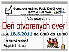 Rôzne výskumy a štatistické údaje dokazujú, že v poslednom období sa ľudia menej venujú čítaniu. Lekárske výskumy potvrdzujú, že dieťaťu možno čítať už od najútlejšieho veku, pretože veľmi skoro začína vnímať svet okolo seba. Zaneprázdnenosť rodiča má v ranom veku dieťaťa veľmi nepriaznivý vplyv na jeho ďalší vývoj. Práve preto sme sa v Gemerskej knižnici Pavla Dobšinského v Rožňave rozhodli, že streda 18. mája 2011 bude Deň otvorených dverí. V tento deň bude knižnica otvorená od 8.00 do 19.00 hod. a návštevníci si budú môcť prezrieť priestory knižnice, prelistovať knihy, surfovať po internete i