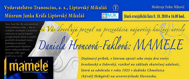 Pozvanie na prezentáciu najnovšej novely Daniely - Faklovej Hroncovej: MAMELE