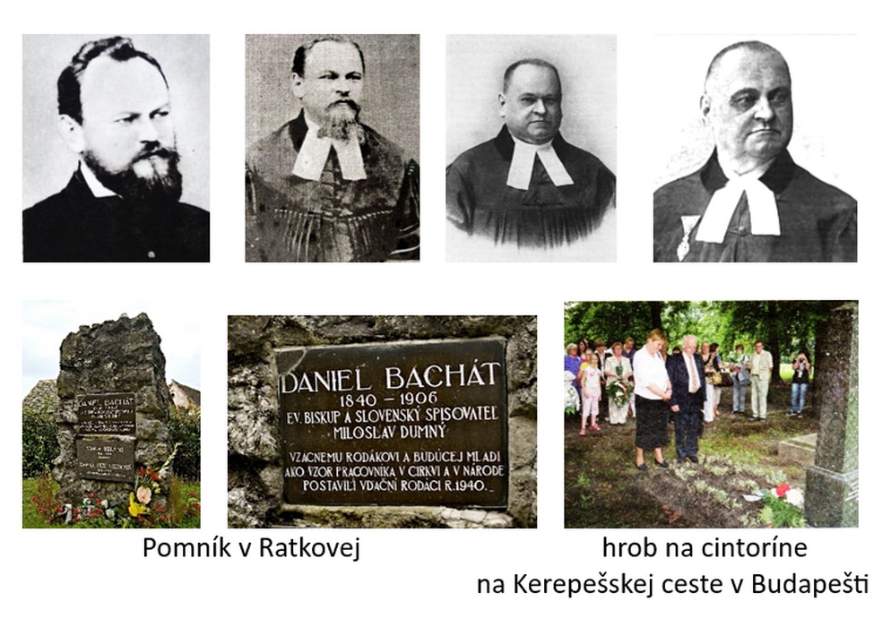 13. apríl – Daniel Bachát (pseudonym Miloslav Dumný) (18.6.1840 Ratková – 13.4.1906 Budapešť) – ev. farár, spisovateľ, prekladateľ, publicista. Študoval na gymnáziách v Spišskej Novej Vsi, Rožňave, teológiu na evanjelickej teologickej akadémii v Prešove a na viedenskej univerzite. Pôsobil ako farár v Pribyline a Hybiach, kde bol organizátorom kultúrneho života a iniciátorom ochotníckeho divadla na Liptove. Od roku 1873 pôsobil v Pešti, kde kráčal v šľapajach svojho predchodcu Jána Kollára, bol zvolený za dekana Budapeštianskej diecézy, na sklonku života sa stal biskupom banského dištriktu. Pričinil sa o oživenie Slovenského spolku v Budapešti, spoluzakladal časopis Dunaj (1874), horlivo pracoval aj v prospech luteránskych škôl. Ako prvý Slovák bol v roku 1879 zvolený za korešpondenta uhorskej literárnej Kisfaludyho spoločnosti, ktorá členstvom ocenila jeho prekladateľskú prácu z maďarčiny a nemčiny. Aktívne sa zapájal do práce Lutherovej spoločnosti od jej založenia a od roku 1891 bol osem rokov jej podpredsedom. V roku 1880 zorganizoval 8. okresný výbor Spoločnosti Červeného kríža v Budapešti, v ktorom desať rokov pôsobil ako tajomník, od roku 1890 bol členom jeho ústredného výboru. Za jeho všestrannú a úspešnú činnosť bol v roku 1898 ocenený Rádom Františka Jozefa I. Od roku 1905 pôsobil ako predseda Uhorskej protestantskej literárnej spoločnosti. Je typickým reprezentantom záverečnej etapy romantizmu, tzv. matičného obdobia. Bol dlhoročným členom Zpěvníkovej základiny, obstarával nové vydania a viedol korektúry náboženských kníh. Písal poéziu, prózu, humoresky, venoval sa aj dramatike, literárnej kritike i publicistike, v ktorej dominovala národná problematika s národno-výchovným poslaním, prekladal z tvorby ruských, maďarských a nemeckých autorov. Básnicky debutoval 1859 v časopise Priateľ školy a literatúry, prispieval do politických novín (Pešťbudínske vedomosti, Národné noviny, Slovenské noviny), do časopisov beletristických (Sokol, Orol, Junoš, Dennica, Dunaj), humoristických (Černokňažník), odborných (Letopis MS), ľudovýchovných (Obzor, Národný hlásnik), cirkevných (Cyril a Metod, Cirkevné listy, Korouhev na Sionu), prejavil sa aj ako dramatik a prozaik v Černokňažníkovi, neskôr v Sokole či v Orle, kde uverejnil sériu próz z veľkomestského života. Príležitostne prispieval aj do českej a maďarskej tlače. Príspevky náboženského charakteru uverejňoval v bibličtine. Patril medzi najplodnejších slovenských spisovateľov. Námety čerpal výlučne zo súčasnosti, z malomestského i veľkomestského prostredia, zo svojich spomienok, zážitkov a skúseností. Jeho divadelné hry sa často hrávali na ochotníckych scénach. Ešte ako študent z Prešova chodil hrávať aj do rodnej Ratkovej. Knižne mu vyšli zbierky poézie Nevädze 1. Básne (Skalica, 1870), Zbožné zvuky (Budapešť, 1885); prozaické práce Nevädze 2. Besiedky (Skalica, 1870), Neväzde 3. Obrázky (Skalica, 1870), Macocha a Všade dobre, doma najlepšie (pod pseudonymom Dunajský, Martin, 1909 a 1925); veselohry Z iskry býva vatra (1862), Rodoľubci (1868), Veta za vetou (1869). Napísal aj učebnicu Malý Katechismus doktora Martina Luthera: co knižečka školská v stručnosti vydaná pro dítky evanjelické (Budapešť, 1901). Z jeho knižne vydaných príležitostných kázní vyberáme: Svätoreč pri zádušniciach... Štefana Moysesa... (Pribylina, 1869); Trúchlopej. Pri zádušniciach... Michala M. Hodži... (Skalica, 1870); Pohrobnia duma pri zádušniciach Andreja Braxatorisa Sládkoviča... (Martin, 1872); Duma pri odhalení pomníka M. M. Hodžu... (Martin, 1872); Kázeň... v čas výročitého shromáždení všeobecné ev. Uherské Podporovni... (Budapešť, 1873), Čím jest a co chce Lutherův spolek? (1899). V Ratkovej má v areáli ev. kostola pomník s pamätnou tabuľou z roku 1940. Neskôr bola na pomník umiestnená pamätná tabuIa ďalších rodákov – maliara Samuela Belániho (1822 – 1850) a botaničky a mineralogičky Izabely Textorisovej (1866 – 1949).