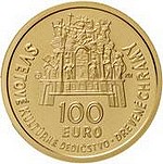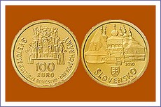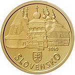 V decembri 2010 vydala Národná banka Slovenska prvú zlatú zberateľskú mincu v eurovej mene. Minca predstavuje kultúrne pamiatky Slovenska zapísané do Zoznamu svetového dedičstva UNESCO – drevené chrámy v slovenskej časti karpatského oblúka a jej nominálna hodnota je 100 eur. Výtvarníci i zberatelia mincí si predtým všimli, že Národná banka Slovenska vyhlásila v júli 2009 verejnú anonymnú súťaž na výtvarný návrh zlatej zberateľskej mince v nominálnej hodnote 100 eur s tematikou Svetové dedičstvo UNESCO - drevené chrámy v slovenskej časti karpatského oblúka. Do súťaže predložilo dvanásť