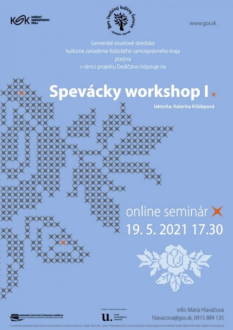 Gemerské osvetové stredisko (GOS) v Rožňave, kultúrne zariadenie Košického samosprávneho kraja, dňa 19. 5. 2021 (streda) o 17:30 pozýva na online spevácky workshop, ktorý je zameraný predovšetkým pre ďalšie vzdelávanie folkloristov, pedagógov či vedúcich detských kolektívov.