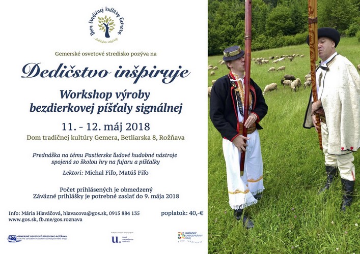 Gemerské osvetové stredisko v Rožňave organizuje po prvýkrát zaujímavý workshop, na ktorom bude hosťovať majster ľudovej umeleckej výroby, výrobca pastierskych hudobných nástrojov. „Michal Fiľo z Banskej Bystrice prijal naše pozvanie, aby naučil záujemcov vyrobiť si svoj originálny ľudový hudobný nástroj - drevenú bezdierkovú píšťalu. Pastierske ľudové hudobné nástroje budú ústrednou témou tohto workshopu, kde sa naučíme techniky výroby signálnej píšťaly, ale aj históriu ľudových hudobných nástrojov a samotné hráčske techniky na pastierske píšťaly a fujaru. Každému účastníkovi zabezpečíme všetky náradia a materiál, s ktorým bude počas workshopu pracovať. Je to jedinečná príležitosť ako sa naučiť vyrobiť si nástroj a pre tých, ktorí ho už vyrábajú, to umožní zdokonalenie,“ uvádza Mária Hlaváčová z Gemerského osvetového strediska.