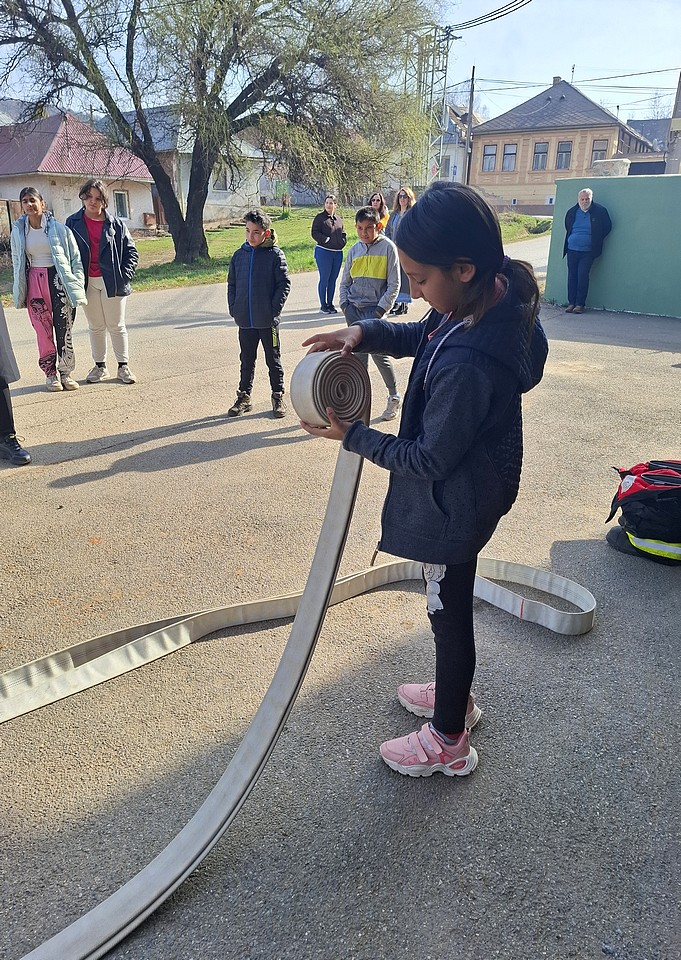 Žiakov sme obliekli do zásahových odevov a mohli si vyskúšať prenášanie hadíc v koši. Ukázali sme, ako sa pracuje s náradím z hasičskej techniky. Zisťovali sme, či deti vedia, prečo vzniká množstvo požiarov domov, príbytkov. Vysvetlili sme potrebu vody pre hasičov. Ukázali sme im novú techniku – štvorkolku a príves núdzového ubytovania, skrinku na AED, ktorý bude umiestnený na zbrojnici v Jelšave.