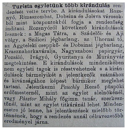 Najstarším pestovaným športom v Rožňave bola turistika, ale jej vyznávači nemali dlho jednotné organizačné vedenie. V roku 1873 vzniká Uhorský karpatský spolok (Magyarországi Kárpát-egyesület - MKE), ktorý sa zameriaval predovšetkým na organizovanie turistiky na Spiši (Kežmarok, Spišská Nová Ves, Poprad, Levoča a ďalšie) a vytváral predpoklady pre pestovanie turistiky vo Vysokých Tatrách. Impulzom na založenie tohto spolku je článok Dr. Mateja Slávika z Dobšinej, uverejnený v rožňavských novinách Sajó-Vidék a Rozsnyó Híradó v apríli 1909. Prípravný výbor spolku mal začať svoju činnosť 9. mája 1909, ale sa presunul na rok 1910, nakoľko vznikli rozpory členov o tom, či vstúpiť do dobre prosperujúceho Karpatského turistického spolku alebo do Maďarského turistického spolku. Rozhodlo sa pre Karpatský turistický spolok, pretože aj bez založenia svojej odbočky v Rožňave urobil veľmi veľa v prospech popularizácie a v prospech turistiky v meste a okolí. V jednej vtedajšej pozvánke sa píše: „Turistický zväz dal do plánov viac výletov. Vedenie v Rožňave, Rimavskej Sobote, Dobšinej a v Jelšave spustí tento plán. Turistické plány z RV sú: Vysoké Tatry, Zádiel, Silická ľadová jaskyňa, jazero na Uhornej, Jaskyňa v Agteleku, Dobšinská ľadová jaskyňa, Volovec, Turecká a Muránsky hrad. Tohto výletu sa môžu zúčastniť nielen členovia, ale aj ostatní. Podľa prianí a počtu ľudí sa to môže hocikedy uskutočniť. Prihlasovať sa môžete u horára Pauchly Rezso, alebo u učiteľa gymnázia Pásztora Mihályho, alebo u sekretárky. Bolo by dobré, keby ste sa čím skôr prihlásili, aby to bolo čím skôr uskutočnené.“
