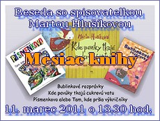 Na besedu so spisovateľkou Martou Hlušíkovou pri príležitosti Mesiaca knihy pozýva Gemersko-malohontské múzeum v Rimavskej Sobote. Beseda sa uskutoční 11. marca 2011 o 13.30 hod. v priestoroch múzea. Záujemci sa s pani spisovateľkou budú môcť porozprávať o veselých rozprávočkách z jej kníh, ako napr. Bublinkové rozprávky, Kde pavúky tkajú cukrovú vatu, Písmenkovo, alebo Tam, kde pršia výkričníky. Skupinovú účasť zo škôl je potrebné nahlásiť vopred telefonicky na číslo: 047/5632741, alebo na e-mail: . Vstup na besedu je voľný.