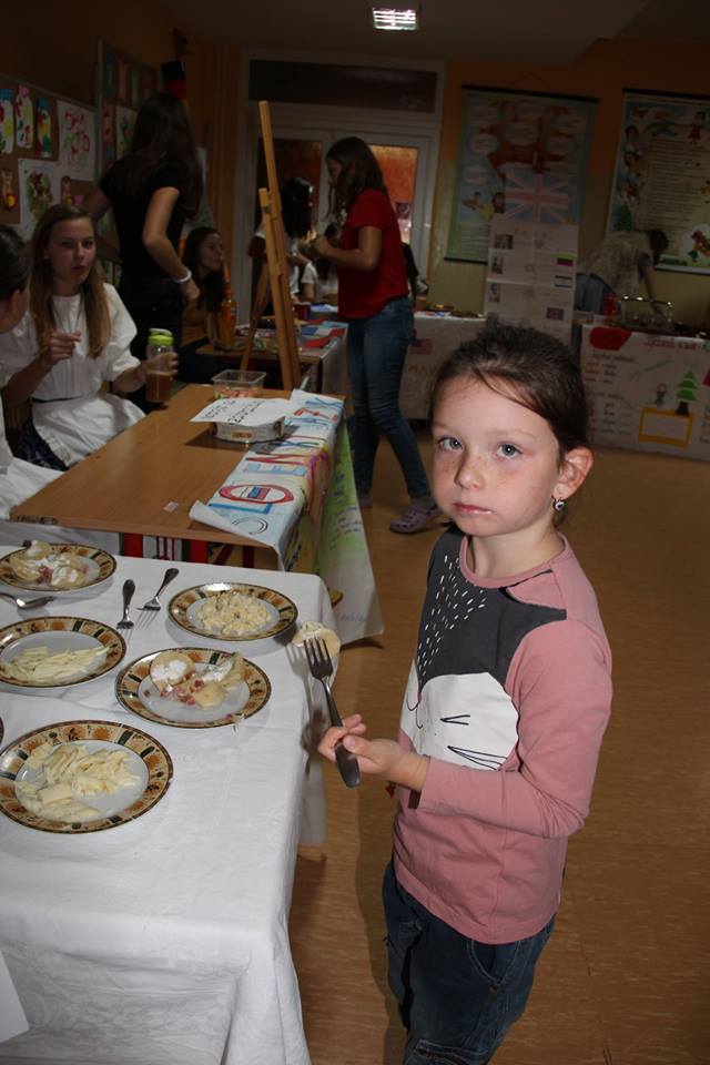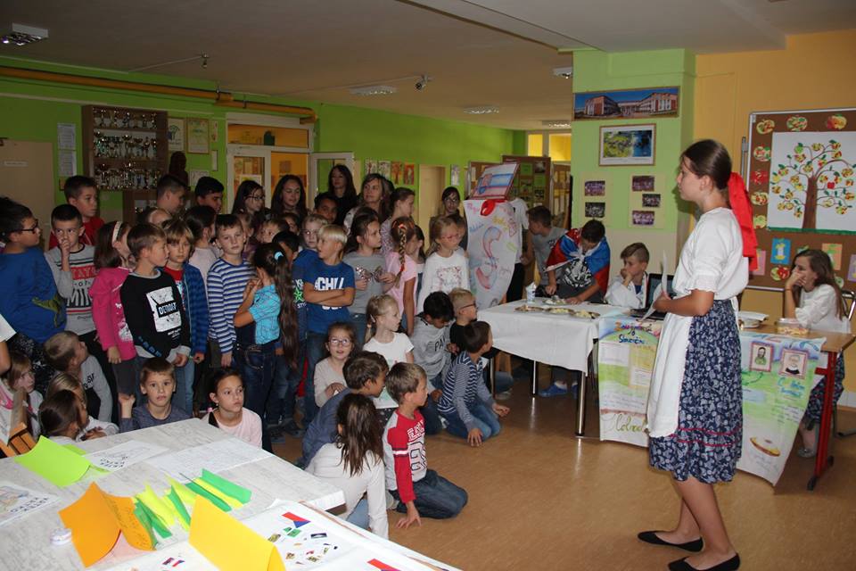 Európsky deň jazykov sme si tento rok v Základnej škole J. A. Komenského v Revúcej pripomenuli naozaj netradične a vo veľkom štýle. Vestibul školy sa premenil na pestrofarebnú zmes stánkov, poskytujúcich zaujímavé fakty a informácie o 6 jazykoch, ktoré sa vyučujú na našej škole a ktorými hovoria naši priatelia z partnerských európskych škôl. V úvodnej scénke žiaci 6. B triedy poukázali na príbuznosť a niektoré odlišnosti slovenčiny a češtiny. Každý stánok zároveň prezentoval kultúru a kulinárske špeciality tej-ktorej krajiny, ako aj slávne osobnosti, ktoré formovali jej dejiny. A tak mohli žiaci našej školy ochutnať v slovenskom stánku pirohy, bryndzové halušky či syrové korbáčiky, v stánku s nemeckým jazykom sa im zbiehali slinky na Sacherovu tortu,