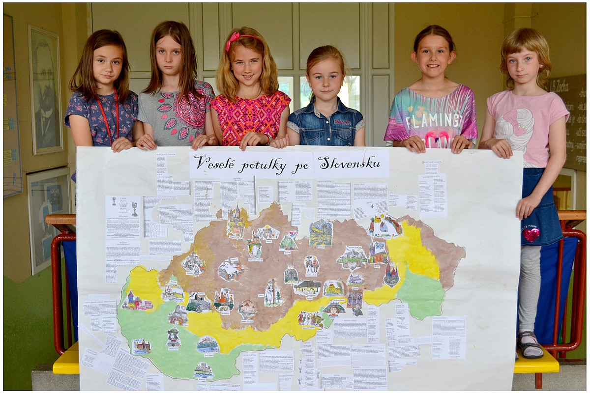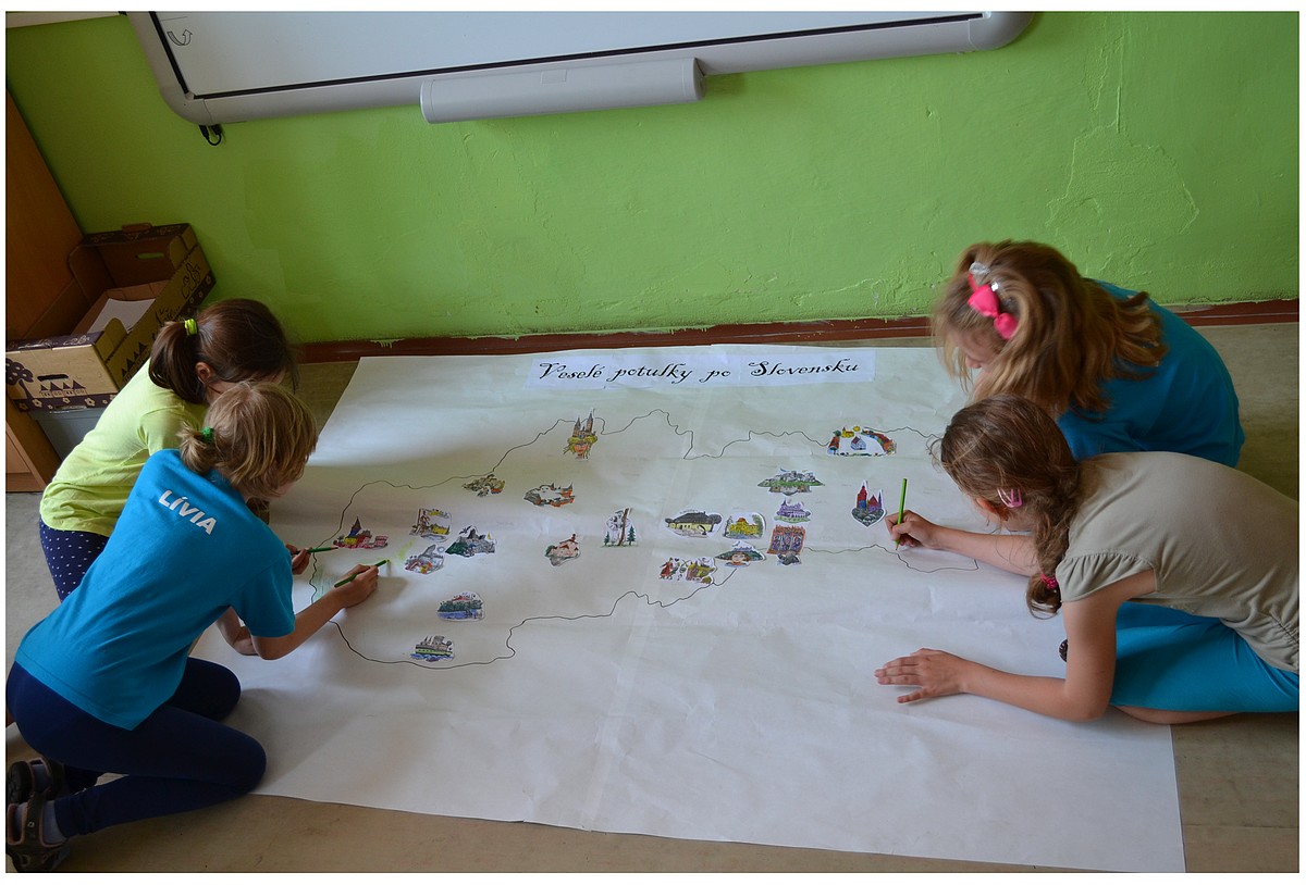 deti farebne dotvorili. Na mape nám tak pribúdalo stále viac a viac historických pamiatok, hradov a zámkov. Ku každému miestu a mestu sme pridali malú básničku, povesť z pera Štefana Moravčíka, ktorého deti dôverne poznajú z čítaniek. Jeho príbehy nielenže vysvetľujú a opisujú ako vznikli názvy miest a dedín, kto prebýval a vládol na hradoch a zámkoch, ale aj veľa iných zaujímavých vecí z histórie. Na mape máme ešte stále čo dokresľovať a vyznačovať. Najbližšie sa zameriame na naše najväčšie rieky a pohoria. Naša obrázková mapa zdobí nástenku v škole. Keď sa pri nej deti pristavia horlivo diskutujú a ukazujú na mape, ktoré miesta už poznajú, čo tam videli, kde sa chystajú na školský výlet, alebo počas prázdnin so svojimi rodičmi.