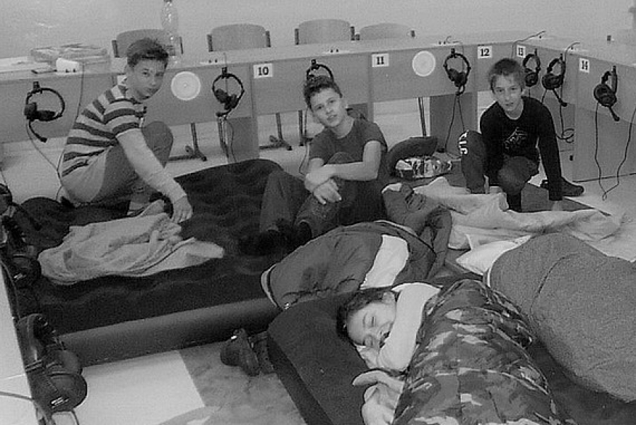 Od 00:00 hod. prebiehali športové turnaje v telocvični: vybíjaná, volejbal, futbal a stolný tenis. Postupne sa deťúrence vytrácali do svojich „spální“, tí najvytrvalejší vydržali do 02:30 hod. Potom nasledovala pre všetkých večierka a kľud vydržal do rána 06:30 hod., kedy nám ôsmaci pripravili budíček. Čakalo nás balenie a upratanie tried, tá časť programu, ktorá deti baví najmenej, lebo chcú ešte raz prežiť noc plnú aktivít v škole.