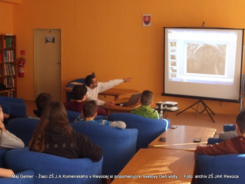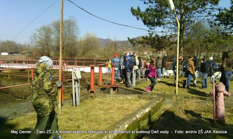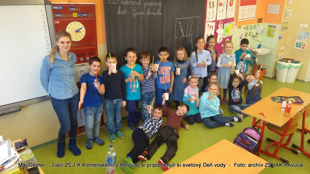 Každoročne 22. marca si pripomíname svetový Deň vody. A nebolo tomu inak ani 22. 3. 2018 v Základnej škole J. A. Komenského. V tento deň sme si pripomenuli význam tejto vzácnej tekutiny, bez ktorej by život na našej planéte nebol možný. Voda si zaslúži našu veľkú pozornosť a vďaku za to, že sme. Hneď v úvode dňa sa naši šiestaci stretli s pracovníkom vodárenskej spoločnosti na zaujímavej prednáške o vode. Dozvedeli sa odkiaľ sa berie voda v našom vodovode, akú dlhú cestu musí prejsť pokiaľ ju s chuťou vypijeme a hlavne ako ju máme šetriť a starať sa o ňu. Siedmaci navštívili našu mestskú čističku odpadových vôd a oboznámili sa s celým náročným procesom prečisťovania znečistenej vody predtým ako odtečie späť do našej rieky. Medzitým žiačky 8. B pripravili pre žiakov školy vodný bar plný chutnej čistej vody.