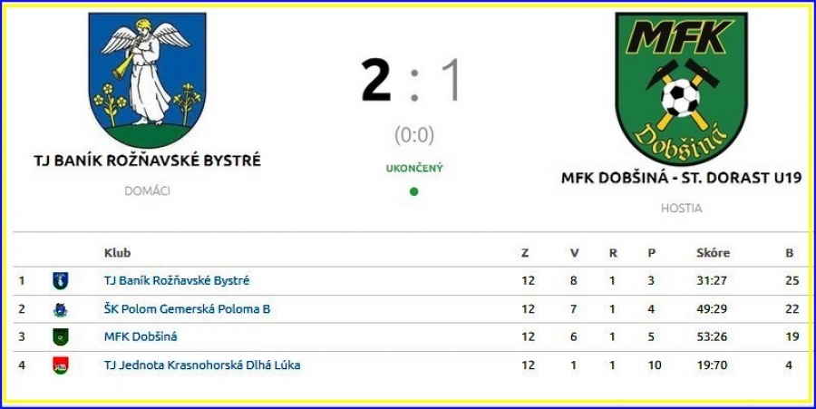 Baník Rožňavské Bystré - MFK Dobšiná 2:1 (0:0). G: A. Vavrek, R. I. Krahula – D. Gábor. ŽK: bez kariet. R: D. Poťmák. Div.: 30.