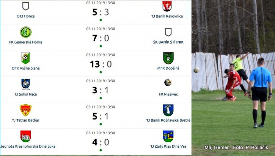OFK Vyšná Slaná – MFK Dobšiná 13:0 (7:0). G: B. Kuzma 5, A. Gallo 3, Š. Domik 2, R. Lindák, M. Fifik, M. Gallo. ŽK: 0 - Š. Brondoš. R: P. Béreš - L. Gyenes, DS: Š. Bodnár. Div.: 88.