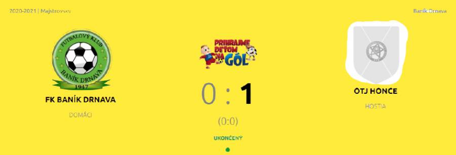 Baník Drnava – OTJ Honce 0:1 (0:0). G: J. Pástor. ŽK: F. Kovács - J. Karalo. R: J. Szor - L. Lorincz. Div.: 0 DRNAVA: G. Józsa – P. Búlik (C), J. Barczi, R. Kovács, P. Gavlák, F. Kovács, D. Tisza, B. Šoltés, G. Zsilla, K. Šoltés, J. Rencsok. HONCE: D. Forgáč – M. Molnár, J. Hric, M. Gallo, M. Pástor, J. Sklenár, J. Pástor, V. Tokoly, Duš. Forgáč, F. Čapó, N. Gallo. Iba pred očami dvoch rozhodcov a dvoch futbalových mužstiev sa zrodil v Drnave dávno nevídaný výsledok. Posledné mužstvo tabuľky, ktoré doteraz nevyhralo zápas, si odviezlo od ašpiranta na víťazstvo v súťaži tri body. Stačil mu na to jeden gól, ktorý premenil v 58. minúte skúsený hráč hostí Ján Pástor. Je to iba jeho druhý gól v tomto ročníku, ale má cenu troch bodov. Také góly sa rátajú dvojnásobne. |
