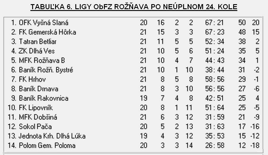 TABUĽKA 6. LIGY ObFZ ROŽŇAVA PO NEÚPLNOM 24. KOLE: