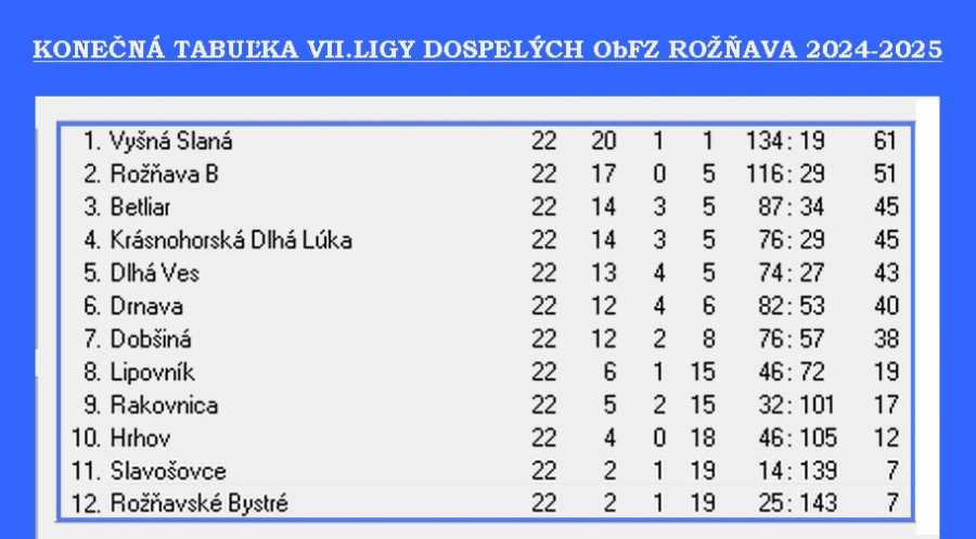 Posledné kolo sa zaskvelo najmä strelecky. V 6 zápasoch padlo rekordných 60 gólov. Štyri zápolenia sa skončili dvojciferným výsledkom. Tri zápasy vyhrali domáci a tri hostia. Strelecky sa doslova prezentovali Patrik Mičinsky (Dlhá Ves) a M. Tokarčík (Dobšiná), ktorí po 6-krát rozvlnili sieťe súperov. Futbalový ročník 2024/2025 patrí jednoznačne OFK Vyšná Slaná, ktorí sa presadili proti súperom najmä v odvetnej časti súťaže, keď dovtedy vedúca rezerva MFK Rožňava stratila rozhodujúce body. Víťaznú trofej im odovzdal po zápase 22. kola so Slavošovcami predseda ObFZ Džubák. Najslabším kolektívom v tomto ročníku sú futbalisti TJ Baník Rožňavské Bystré, ktorí boli súpermi pokorení viackrát dvojciferne. Vrámci kompletnosti uvádzame aj rozhodnutie ŠTK ObFZ, ktorý znie: „ŠTK ObFZ Rožňava kontumuje zápas 21. kola 7. ligy dospelých Dlhá Ves – MFK Rožňava 3:0 v prospech domácich za nenastúpenie hostí.“