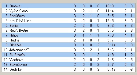 Výsledky 3. kola I. triedy: Drnava – R. Bystré 5:0, Krh. Dlhá Lúka – Dedinky 8:0, Slavošovce – Dlhá Ves 0:1, FC Brzotín – Jablonov n/T 2:2, Rudná – Betliar (odložené), Bohúňovo – Vlachovo 2:1, Vyšná Slaná – Hrhov 5:0.
