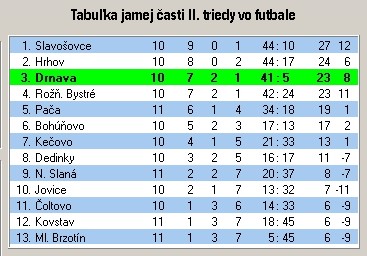 DRNAVA - Kečovo 8:0 (3:0), góly: Mázik 3, Fábián 2, T. Petro, Slávkay, J. Kovács. Dve kolá pred koncom futbalovej súťaže II. triedy si Drnava už zabezpečila 1. miesto. Po neistom začiatku, ale presvedčujúcom výsledku sa tak Drnava tešila už z istého celkového prvého miesta, a tak si zabezpečila aj postup do I.triedy. Od prvého kola boli hráči Baníku na čele tabuľky. Ani raz toto miesto neprepustili nikomu a už ani neprepustia. Drnava ťahala neskutočnú sériu víťazných zápasov, ktorá sa ukončila až na jar v Dedinkách, a tak je ich víťazstvo zaslúžené. Prehrali iba raz, aj to na domácom ihrisku so Slavošovcami. Vráťme sa však ku zápasu s Kečovom.