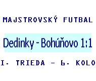 Lokomotíva CHZ Dedinky - FK Sokol Bohúňovo 1:1 (0:1). Futbalistom spod Geráv tohtoročná jeseň vôbec nevychádza podľa predstáv, ktorú mali na začiatku súťaže. V minulom kole nevycestovali k súperovi pre nedostatok hráčov. Aj ostatnom zápase 6. kola I. triedy im chýbali kľúčoví hráči a na ich hre to bolo aj vidno. Hrali pomaly, chaoticky, bez kombinácii. Síce bojovali, ale to nestačilo na získanie vytúžených troch bodov. V hre im chýbal moment prekvapenia. Hostia potvrdili, čo sa od nich čakalo, s posilnenou defenzívou a rýchlymi protiútokmi mladí a rýchli útočníci podkurovali domácej obrane. Domáci boli síce v nej pomalí, ale niektoré akcie hostí odvracali. Prvá veľká možnosť na dosiahnutie gólu sa im naskytla v 10. min. Priamy kop z 18. metrov Majerčák krásnou strelou trafil pavučinu brány, ale hráč hostí hlavou odvrátil na rohový kop. Ďalej sa hralo v strede ihriska, kde boli časté súboje, ale ani jedno mužstvo neohrozilo brankárov. V 41. min. hosťom vyšiel rýchly protiútok a Csík obišiel dvoch obrancov, aj brankár bol bezmocný. Do druhého polčasu domáci hráči