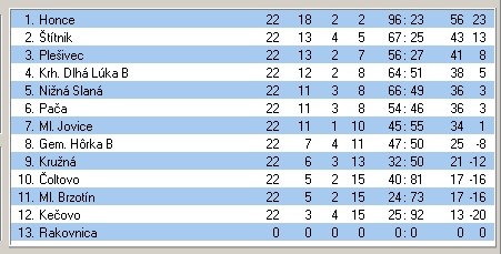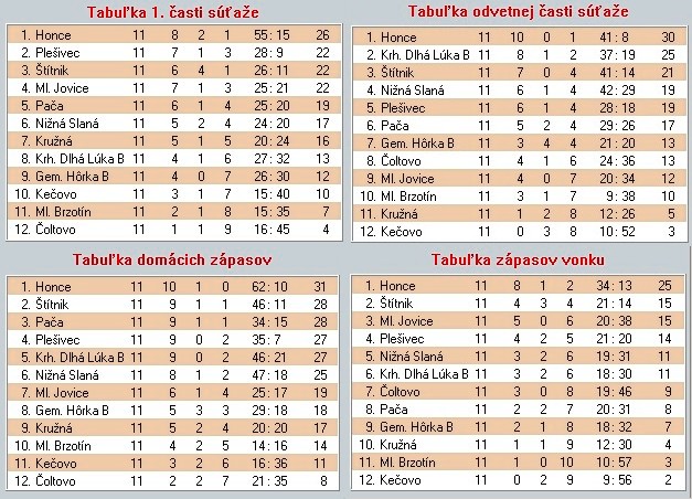 pozvánku do I. triedy aj oni. Ostatné zápasy už nemali možnosť prehovoriť do vyšších priečok. Padlo v nich však pomerne hodne gólov. Najviac gólov padlo na Pači v zápase s Čoltovom -9. Rekord mohol padnúť aj v Joviciach, kde za 20 minút brankár hostí z Ml. Brzotín vyťahoval loptu zo siete až sedemkrát. Potom musel rozhodca ukončiť zápas, lebo hosťom zostalo na ihrisku iba šesť hráčov. Gratulujeme však futbalistom Honiec, ktorí v tomto ročníku podávali najpresvedčivejšie výsledky a s veľkým náskokom vyhralo aj práve skončený ročník. Dúfajme, že sa im bude dariť aj vo vyššej súťaži.