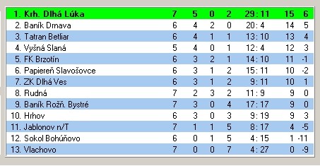 Ostatné výsledky 7. kola: Brzotín - Slavošovce 2:5, góly: A. Polyák, Ra. Znak – Varga 3, Lipták Giba 2; Betliar - Dlhá Ves 3:1, góly: Ján Gonos, Z. Zdechovan, Barkasz – Blatník.