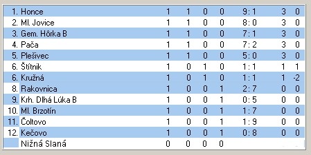 Výsledky: Honce – Čoltovo 9:1, Plešivec – Krh. Dlhá Lúka B 5:0, Gem. Hôrka B – Ml. Brzotín 7:1, Pača – Rakovnica 7:2, Kružná – Štítnik 1:1, Jovice – Kečovo 8:0. Nižná Slaná mala voľno.