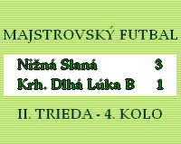 Nižná Slaná – Krásnohorská Dlhá Lúka B 3:1 (2:0). Nižnoslančania sa vo 4. kole II. triedy snažili udržať si 3 body doma. Súperom im boli mladí hráči Krh. Dlhej Lúky B. Stretli sa dve rôzne filozofie futbalu. Kým domáci reprezentovali pressing, rýchle nahrávky, hostia skôr silový behavý s dlhými nahrávkami. Takže sa očakával vyrovnaný zápas. V minulej sezóne v poslednom stretnutí dokázali chlapci z Krh. Dlhej Lúky predbehnúť v tabuľke práve zaváhajúcu Nižnú Slanú a tak skončili na 4. mieste. Nižná Slaná, ašpirant na postup, však v tomto zápase nedopustil žiadne prekvapenie. Veľmi pekným futbalom sa prezentovali celý zápas, ich pressingová hra bola nad sily hostí a s touto úrovňou hry by obstáli v pohode aj v I. triede. Hostia opäť prišli v slabšej zostave, ale konečne sa do brány vrátil D. Máté, no na striedanie opäť nikto nebol pripravený.