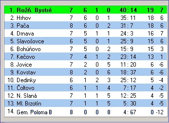 Ostatné výsledky 23. kola: Hrhov - Pača 3:2 (2:0). Domáci odohrali ešte v sobotu dobrý a vyrovnaný zápas. Vyhrávali už 3:0, ale súper sa nevzdával a v druhom polčase sa mu podarilo poriadne skomplikovať domácim zápas.