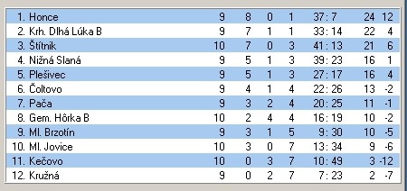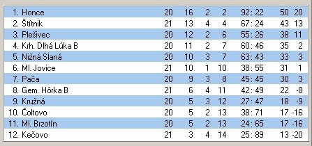 Krh. Dlhá Lúka B – Nižná Slaná 4:2, Ml. Brzotín – Honce 0:2, Jovice – Kružná 3:2, Kečovo – Pača 0:7, Štítnik - Gem. Hôrka 8:3.