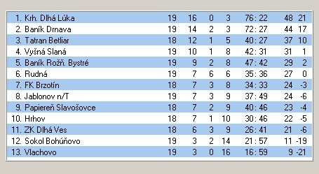 stráca súpera bojujúceho o postup do vyššj súťaže. A Vlachovo hrá len toľko, koľko mu súper dovolí. Nebyť kiksu Betliarčanov v zápase s nimi, držali by Čierneho Petra aj naďalej. S vedúcim mužstvom tabuľky dosiahli však prijateľný výsledok, aj keď hrali s nimi doma. Dobrý dojem nezanechalo  jablonovské mužstvo v Rudnej, kde dohrávalo zápas bez jedného svojho vylúčeného spoluhráča. Vraví sa, že za likvidačný faul na domáceho hráča. Dobrý chír neprišiel ani z Dlhej Vsi, kde zápas Betliarom za stavu 1:4 nedohrali pre inzultáciu rozhodcu v 63. minúte zápasu.