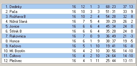 Výsledky 16. kola: Honce – Plešivec 1:2, Rakovnica – Kečovo 4:2, Dedinky – Rožňava B 6:1, Brzotín – Čoltovo 3:1, Pača – Jovice 1:6, Nižná Slaná – Štítnik B 3:1.