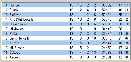 Výsledky: Ml. Brzotín – Čoltovo 4:2, Štítnik – Honce 3:0, Kečovo – Plešivec 0:6, Jovice – Gem. Hôrka B 2:1, Kružná – Pača 1:1.