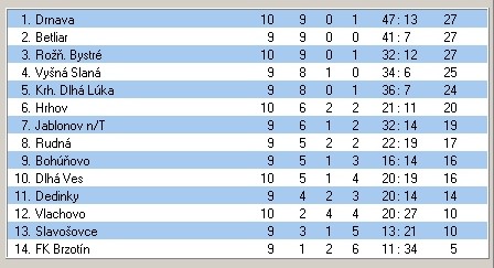 Rožňavské Bystré – Drnava 3:2 (0:1). Góly Bystrého: Urban ml. 2, Tomko, za hostí Bulík, Rencsok. V ďalšej dohrávke futbalovej súťaže I. triedy sa na dobre pripravenom trávniku v Rožňavskom Bystrom predstavil súper zo špice tabuľky - Drnava. Drnave absentovalo viacero hráčov a nastúpili len desiati. V prvom polčase však tento hendikep nebolo vidieť. Od úvodu sa hralo bez výraznejších šancí. Prvú strelu na bránu vyslal drnavský hráč z priameho kopu, s ktorou si však Koncz