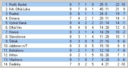 Výsledky I triedy 8. kolo: Rožňavské Bystré - Vlachovo 2:0, Rudná - Hrhov 6:0, Krásnohorská Dlhá Lúka - Jablonov n/T 7:2, Dedinky - Slavošovce 1:1, Vyšná Slaná - Honce 2:3, Štítnik - Bohúňovo 3:1, Drnava - Dlhá Ves 5:1.