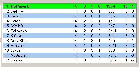 Ostatné výsledky II. triedy: Honce - Štítnik B 3:1, Pača - Čoltovo 9:2, Brzotín - Rožňava B 2:8, Dedinky - Kečovo 9:1, Rakovnica - Plešivec 4:2.