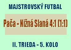 Pača – Nižná Slaná 4:1 (1:1). Gól Nižnej Slanej: O. Junger. Zostava: Krnáč – Karas (C), Slovák, Soják, Schwarz – Leštach, Keršák, Prónai, O. Junger - Die, Gelda, striedali: Die (od 70. min. D. Hajči). V piatom kole II. triedy cestovala Nižná Slaná k novému lídrovi tabuľky, do Pače. Ako býva zvykom nepricestovala v najsilnejšom zložení, keď chýbali Cangár a Ján Junger. Navyše k zranenému Hajčimu pribudol Valko. Na druhej strane sa do zostavy vrátil po treste Die, ktorý bol spolu s Valkom najlepším strelcom Nižnej Slanej v predošlej sezóne. Základná zostava sa opäť zmenila, keď sa do nej vrátil Die.