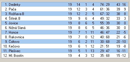 Výsledky 19. kola: Pača - Honce 6:0, Nižná Slaná - Ml. Brzotín 2:2, Štítnik B - Dedinky 5:2, Jovice - Rakovnica 6:2, Čoltovo - Plešivec 2:1, Rožňava B - Kečovo (hostia neprišli).