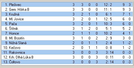 Výsledky 3. kola II. triedy: Plešivec – Nižná Slaná 3:1, Gem. Hôrka B – Čoltovo 1:0, Pača – Krh. Dlhá Lúka 3:0, Kružná – Ml. Brzotín 2:0, Ml. Jovice – Rakovnica 4:1, Kečovo – Štítnik 0:0.